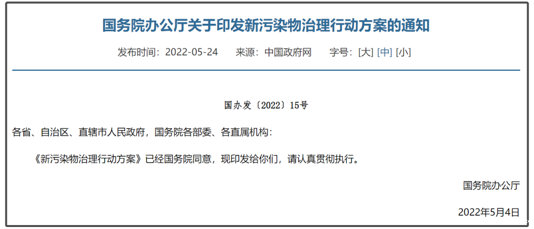 2022年5月,国务院办公厅印发《新污染物治理行动方案》,对新污染物治理工作进行全面部署;